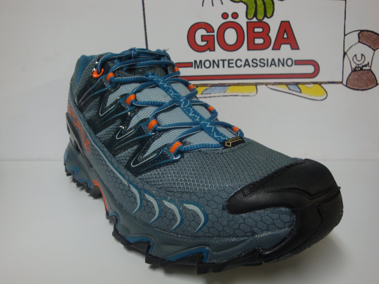 Calzatura in membrana Gore-Tex sviluppata per utilizzi invernali su percorsi off-road di lunga distanza, competizioni ultra-marathon e sessioni di allenamento prolungate. La tomaia ? in mesh anti abrasione traspirante e water repellent, la fodera ? in membrana Gore-Tex Extended Comfort a garanzia di impermeabilit? e traspirabilit?. Il sistema di allacciatura ? integrato alla tomaia a mezzo di fettucce cucite sul tessuto elastico interno e con rinforzi in alta frequenza sul mesh esterno: questo permette di ripartire la tensione dell?allacciatura su tutta la tomaia ed avvolgere meglio il piede per un perfetto comfort di calzata. Ultra Raptor GTX unisce i vantaggi in termini di performance di una costruzione contenitiva a quelli di comfort derivati da una forma comoda e con pianta larga. Il risultato ? un prodotto indossabile per molte ore consecutive ed adatto per utilizzo endurance su qualsiasi tipo di terreno off-road nei mesi invernali o in situazioni di elevata umidit?, grazie alle doti di impermeabilit? della fodera Gore-Tex. Suola ad alta aderenza realizzata in mescola La Sportiva FriXion XF.