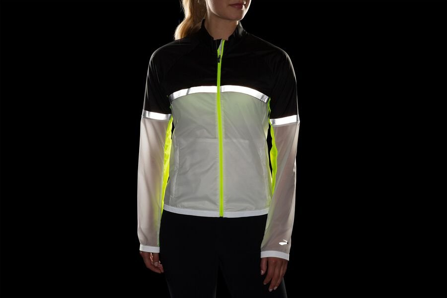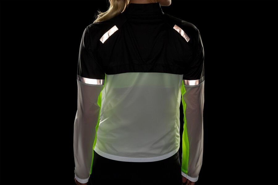 Sii visibile e comoda con questa giacca da corsa da donna. Il tessuto leggero resiste al vento e all’acqua mentre la riflettività mirata aumenta la visibilità.