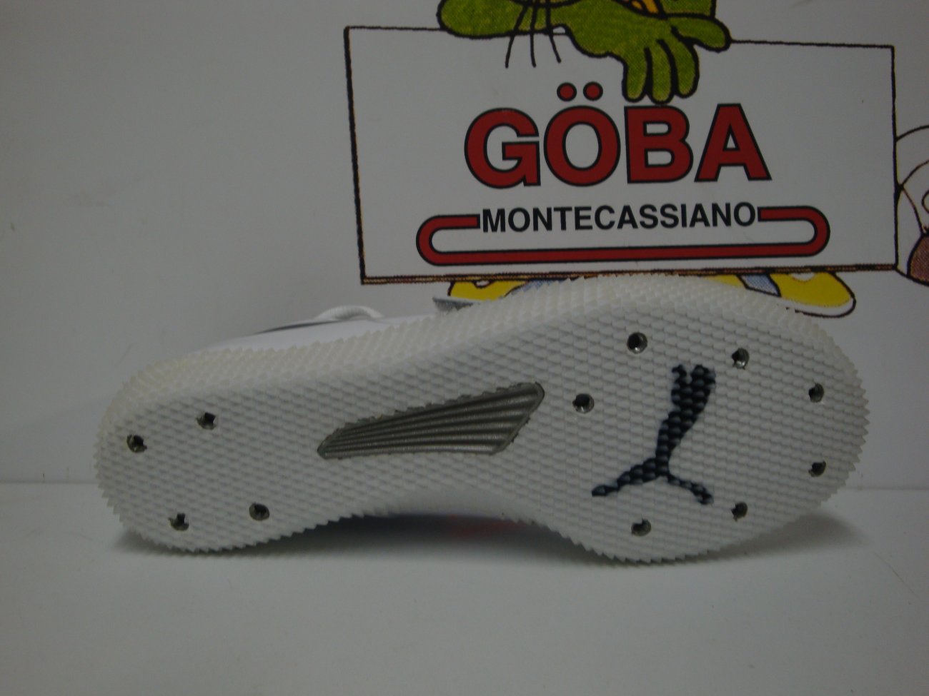 Tomaia in materiale sintetico con linguetta in mesh. Allacciatura tradizionale supportata da fascia in velcro. Intersuola in EVA con piastra di sostegno. Suola composta da i antiscivolo in TPU,con 11 alloggiamenti per i chiodi (7 nell'avampiede e 4 nel tallone). Scarpa raccomandata per atleti agili,di medio e alto livello tecnico,e' una chiodata specifica per chi pratica il salto in alto.
