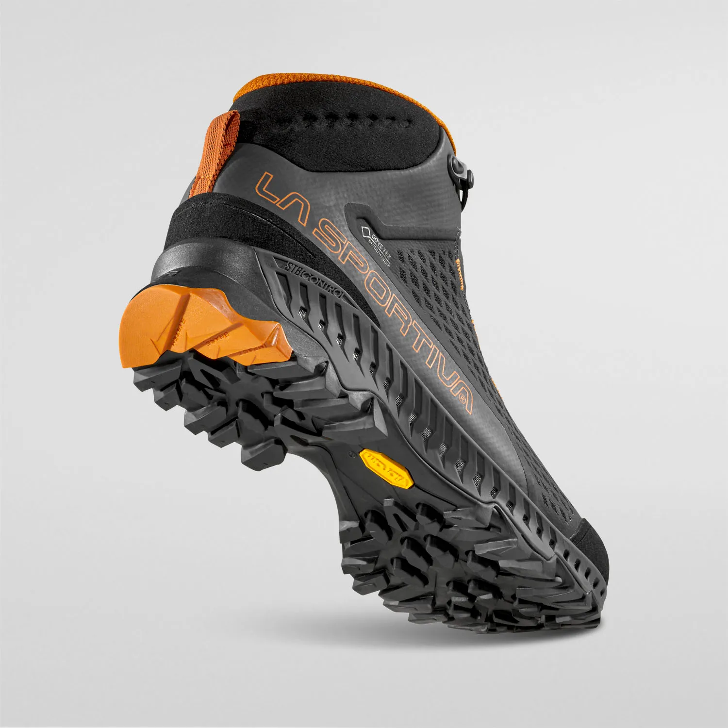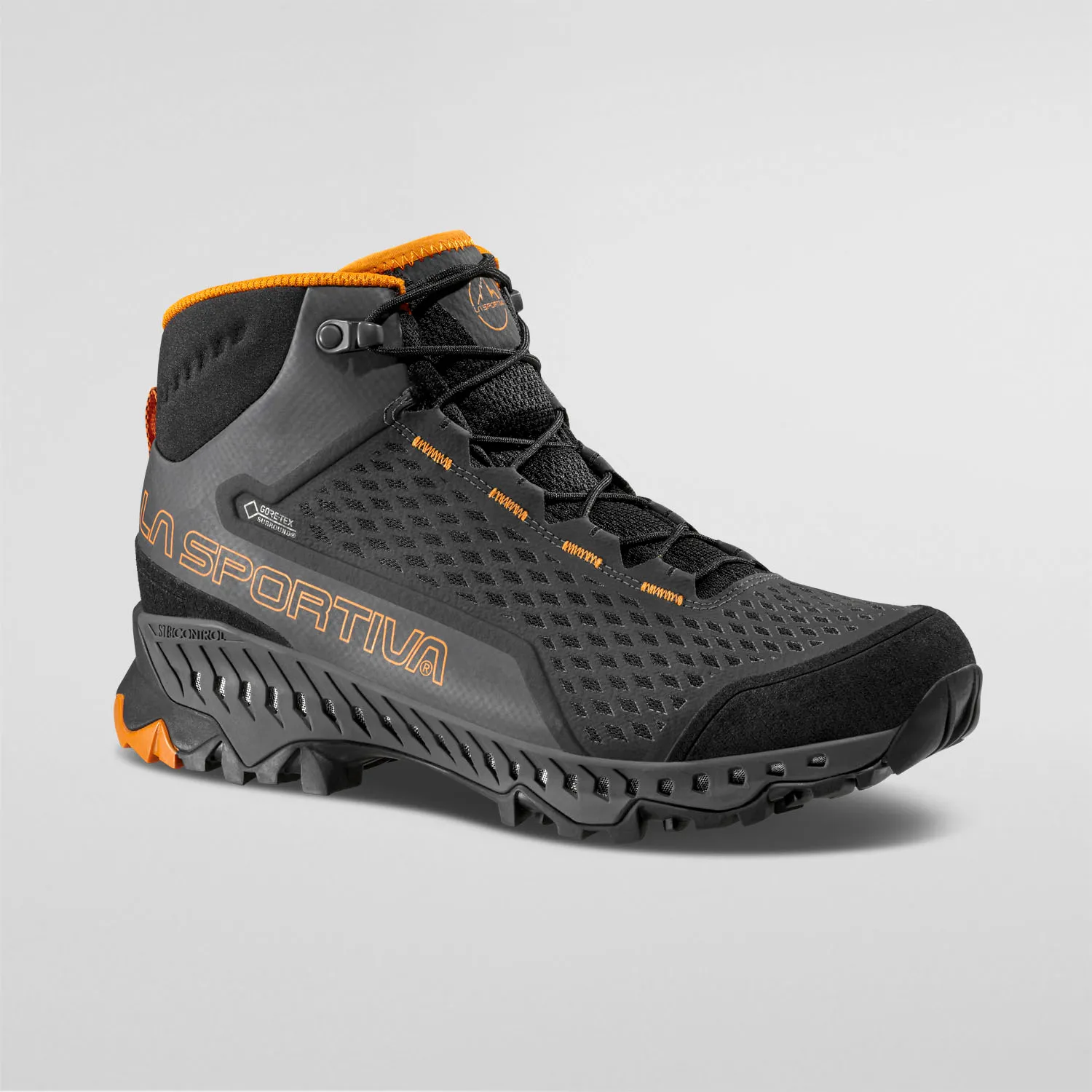 Stream é lo scarponcino fast hiking mid-cut di nuova generazione per l?escursionismo veloce. Adotta soluzioni che sono parte del DNA mountain La Sportiva combinandole a tecnologie e concetti di derivazione Mountain Running per un prodotto versatile, impermeabile e super traspirante grazie alla nuova tecnologiaGORE-TEX SURROUND: soluzione esclusiva che permette una traspirabilita' totale grazie alla maggiore superficie d'areazione che comprende tomaia, sottopiede e l?intersuola in EVA e TPU forata lateralmente. I canali d?areazione visibili lungo il profilo dell?intersuola, sono protetti da una retina in Nylon mono-bava molto resistente per evitare l?entrata di sassolini ed impurit?. La tomaia mid-cut realizzata con struttura Nano-Cells 2.0 composta da cellette super traspiranti che lavorano in sinergia con la membrana GORE-TEX SURROUND per una traspirabilit? aumentata senza precedenti. La parte inferiore della calzatura vede l?integrazione dello Stability control System?, sistema di stabilizzazione anti-torsionale che integra i fori d?areazione della tecnologia GORE-TEX? SURROUND?. Il battistrada in mescola Vibram XS Trek per un ottima tenuta su terreni duri, morbidi e fangosi. Traspirabilit? e comfort a 360 gradi.