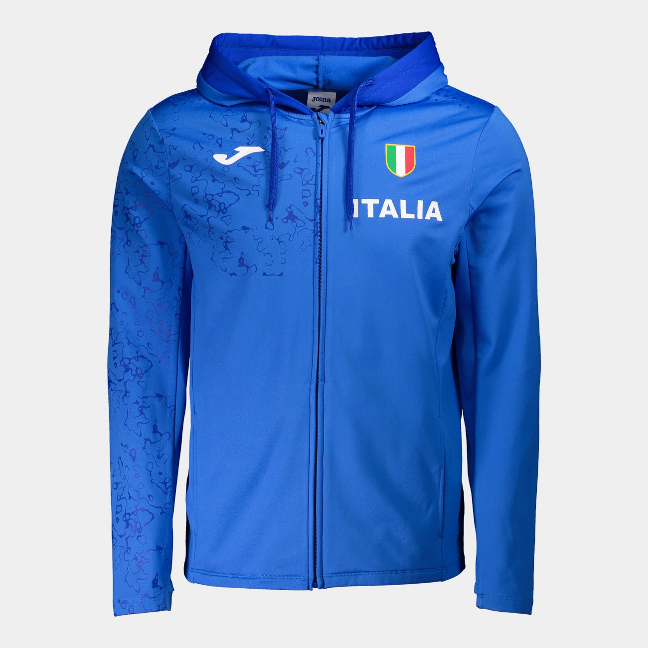 D'altra parte, incorpora una stampa accattivante che disegna sagome sul colore principale, dando un tocco diverso e moderno alla felpa della Federazione Italiana di Atletica Leggera. Sulla schiena, i colori della bandiera italiana sono sublimati dall'effetto ottico. Sul davanti, ha un'altra stampa personalizzata ITALIA e il logo Joma.