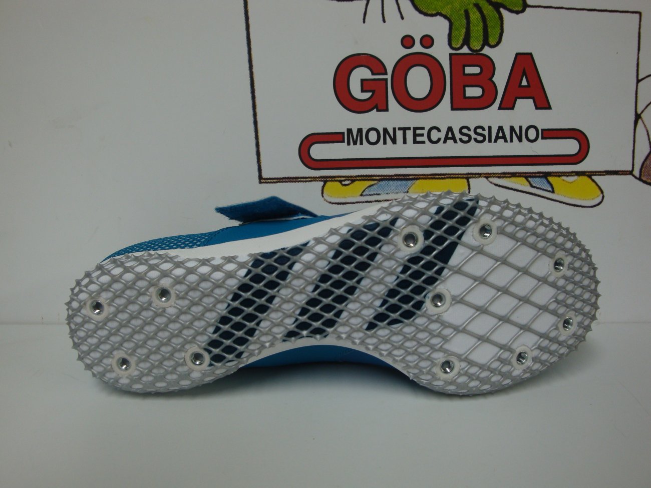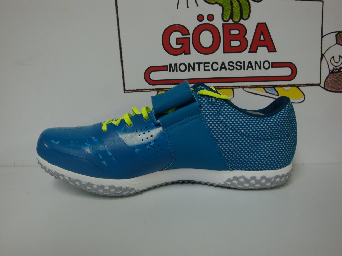 Tomaia in materiale sintetico con linguetta in mesh. Allacciatura tradizionale supporttata con ampia fascia in velcro.. Intersuola in EVA con piastra di sostegno. Suola composta da i antiscivolo in TPU,con 11 alloggiamenti per i chiodi (7 nell'avampiede e 4 nel tallone). Scarpa raccomandata per atleti agili,di medio e alto livello tecnico,e' una chiodata specifica per chi pratica il salto in alto.