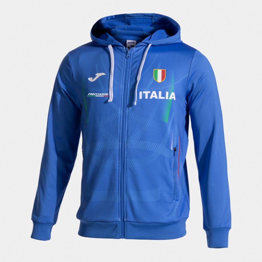 D'altra parte, incorpora una stampa accattivante che disegna sagome sul colore principale, dando un tocco diverso e moderno alla felpa della Federazione Italiana di Atletica Leggera. Sulla schiena, i colori della bandiera italiana sono sublimati dall'effetto ottico. Sul davanti, ha un'altra stampa personalizzata ITALIA e il logo Joma.
