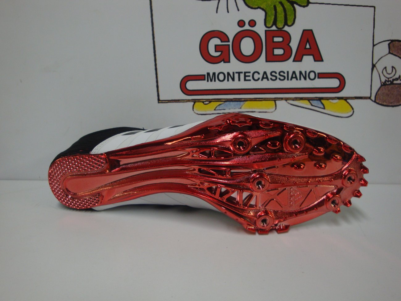 Allacciatura tradizionale supportata con fascia in velcro. Plantare in EVA. Intersuola in Eva preformata. Suola in TPU a tutta lunghezza con 6 alloggiamenti per i chiodi. IDEALE PER GARE IN RETTILINEO (100 m) E' DEDICATA A SPRINTER DI ALTO LIVELLO TECNICO PARTICOLARMENTE ESIGENTI.