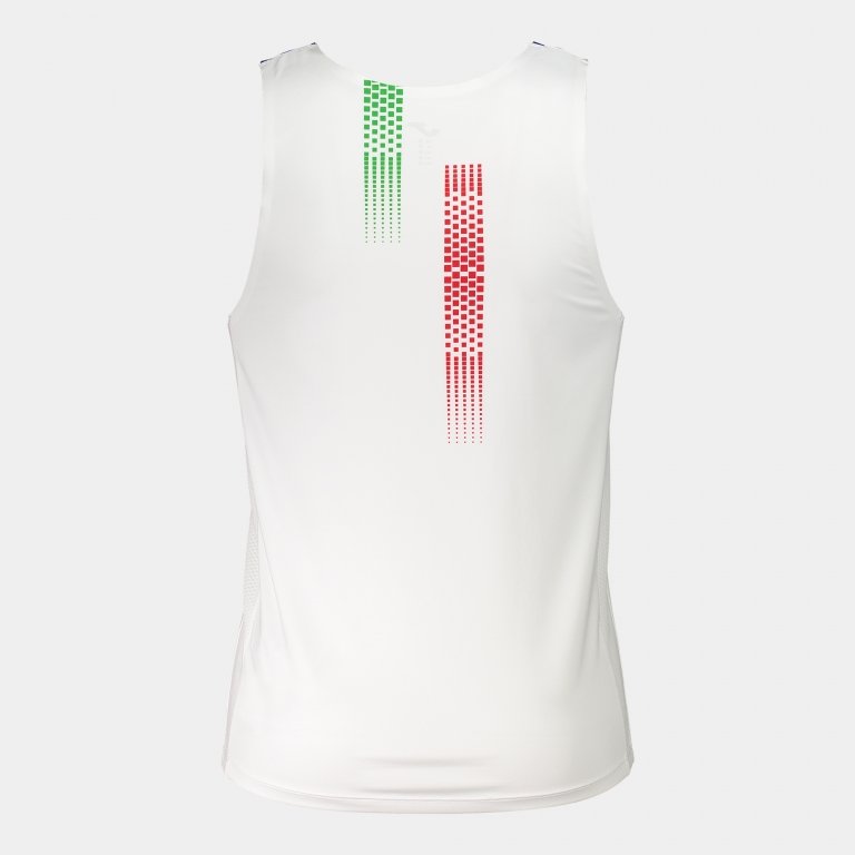 Canottiera da uomo. Modello da competizione della collezione FIDAL, progettato solo per fornire alte prestazioni durante la competizione. Si tratta di una canottiera altamente leggera, comoda e traspirante, ideale per competere. Incorpora un collo rotondo. Questa zona e le bretelle hanno un taglio laser a favore del comfort. In questo modo si prevengono possibili irritazioni dovute all'attrito con la pelle. Si tratta di una maglia molto leggera, fresca e traspirante. Realizzata in tessuto elasticizzato che si adatta al corpo dell'atleta e contribuisce alla sua libertà di movimento. Sulle ascelle e sui lati, incorpora pezzi della tecnologia Micro-Mesh System, situati nelle zone di maggiore sudorazione. Il sudore rimarrà lontano dalla pelle, mantenendo la temperatura costante per tutto il tempo e limitando i cattivi odori. Design con i colori della Federazione Italiana di Atletica Leggera, con stampa effetto ottico sulla metà superiore. Accompagnato da dettagli in stampa della bandiera italiana sul retro e sul davanti. Con stampa personalizzata dall'ITALIA sul petto. Logo Joma serigrafato.