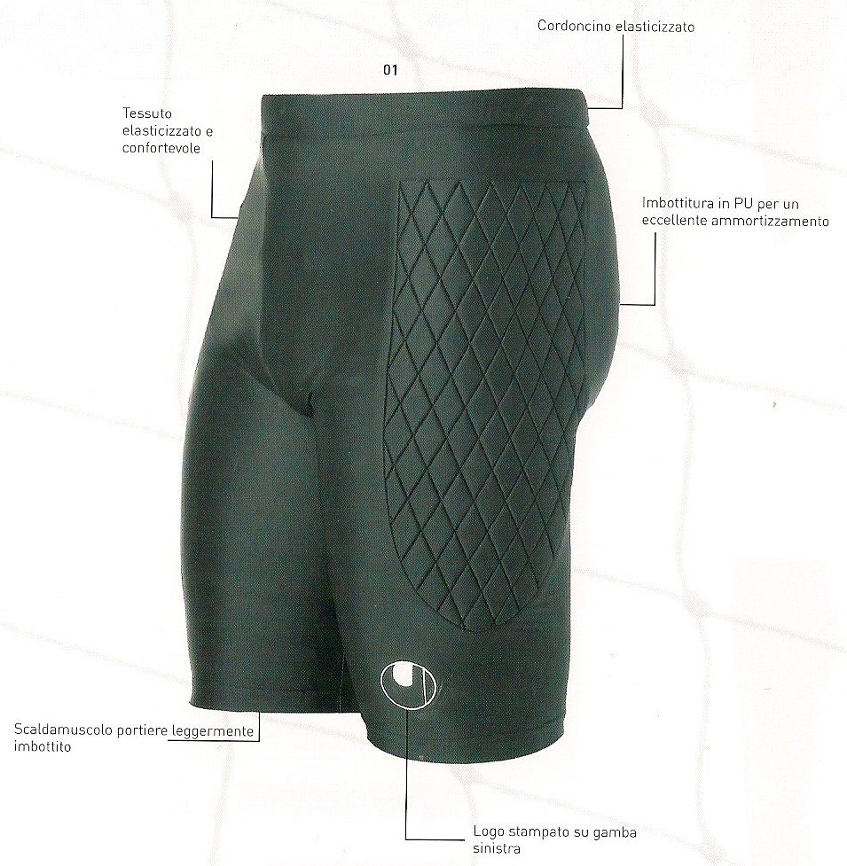 GOALKEEPER-TIGHTS SCALDAMUSCOLO DA PORTIERE IMBOTTITO. COLORE NERO Tessuto principale molto confortevole ed elastico. Imbottiture realizzate nella nuova schiuma in PU per un eccellente ammortizzazione e un minimo spessore. Cordoncino elastico in vita. Materiale 80% Poliammide,20% Spandex