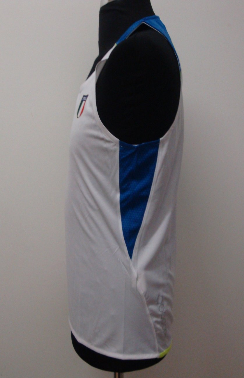 Canotta in poliestere. Stampa rifrangente sul retro. Dettagli fluo in contrasto. Tessuto strutturato su spalle e fianchi. Logo e scritte Italia stampato. Composizione:100% poliestere.